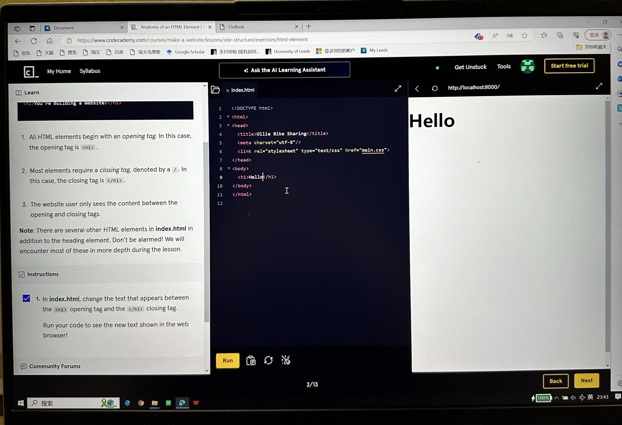 I used the free Codecademy course to get a primer on HTML and CSS in preparation for the workshop (pictured above). I learnt about the HTML web skeleton, where all web content is defined and presented. Learning how to use tags correctly made me realise that web design is not only about visual presentation, but also about implementing the code wisely through clear codes that are easy to maintain and extend the structure. Secondly, I also learnt that website creation is not only about coding, but also about web experience and accessibility. In addition, I have learnt about the role of css in beautifying the appearance of web pages.