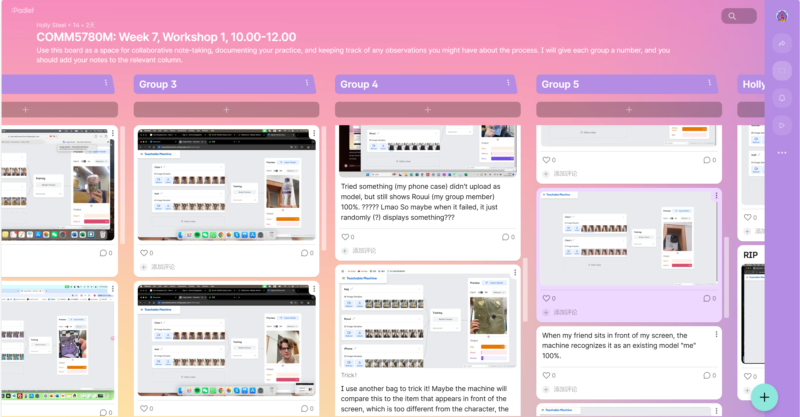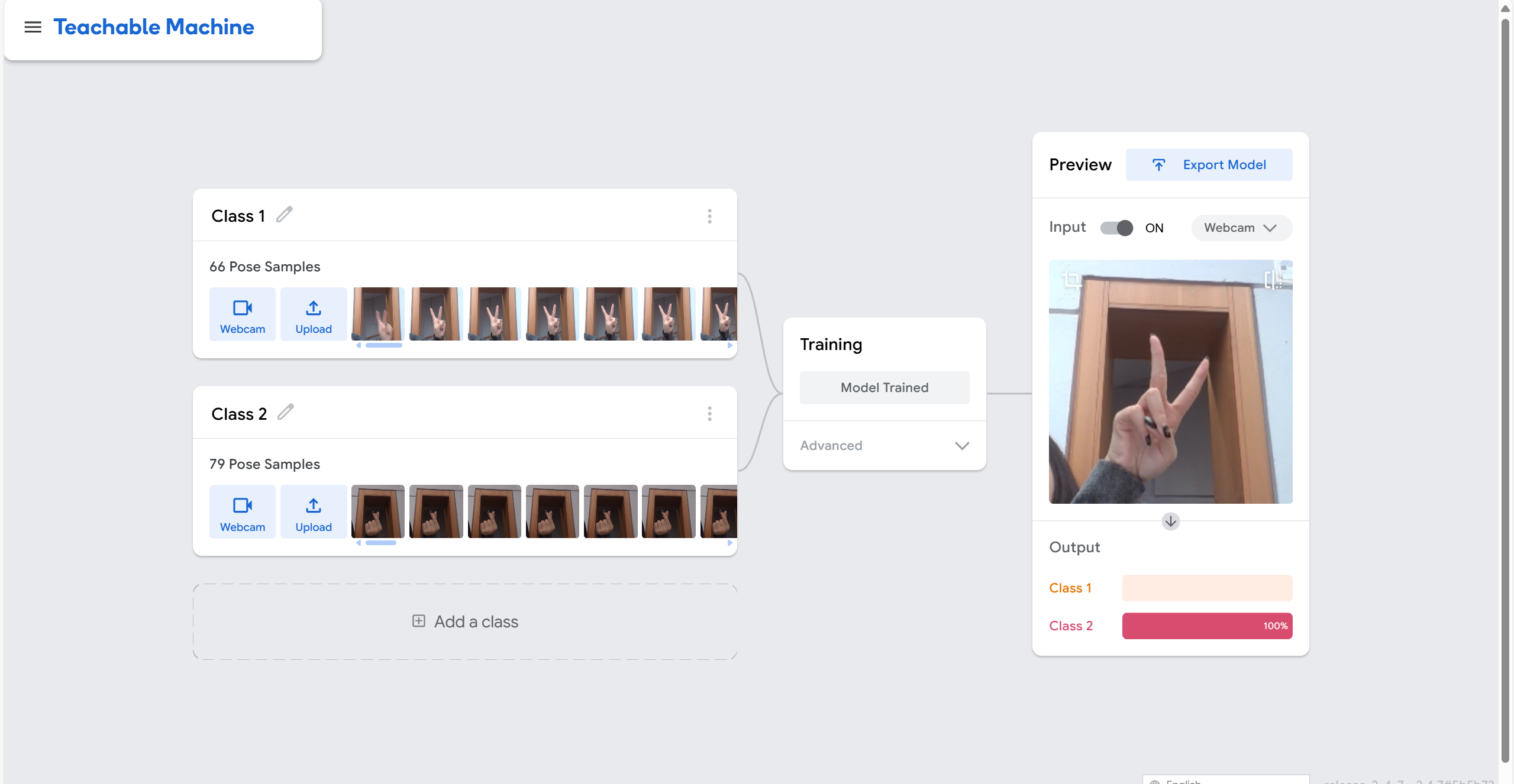 The following pictures are screenshots viewing the process of applying the Teachable Machine: