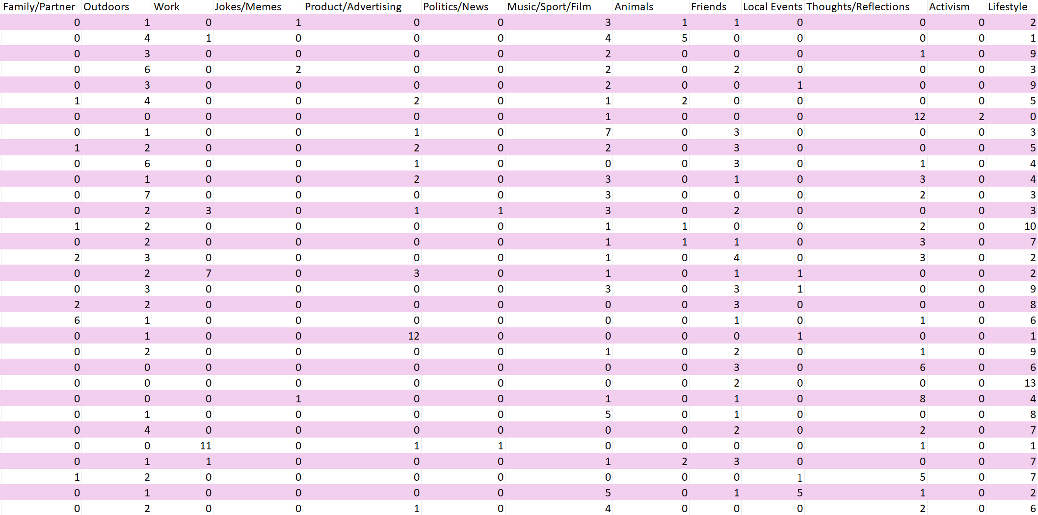 Finally, the categorization of 32 friends' social media posts across 15 categories is consistent with Sumpter's (2018) simplified approach to categorizing friends. However, the data set is incomplete as it only captures the most recent 25 posts, which fails to account for the full complexity of the situation and does not provide a comprehensive representation of the individual in question.