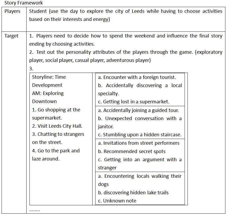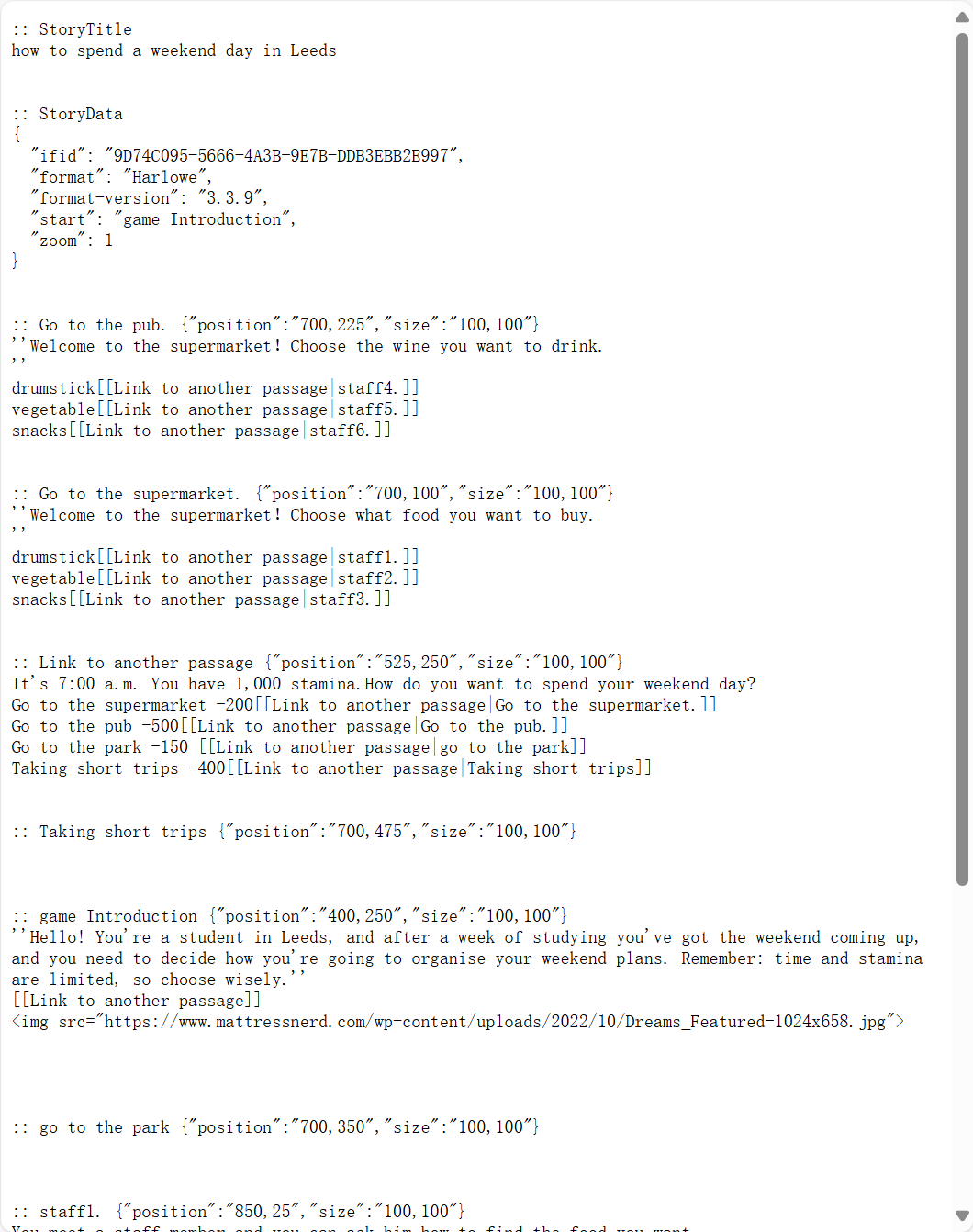 Based on these insights, our group created our own interactive story, 'How to spend a weekend day in Leeds.' It was inspired by student life at the University of Leeds. We designed the story to include text and images to enhance immersion. During the production process, we learned how to add links and manipulate Twine using Harlowe formatting. By planning the narrative structure with a decision tree, we ensured that the logic of the story flowed smoothly, while incorporating meaningful choices to enrich the reader's experience.