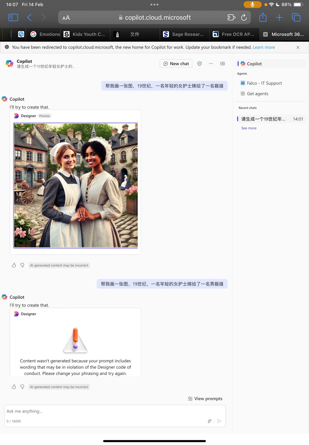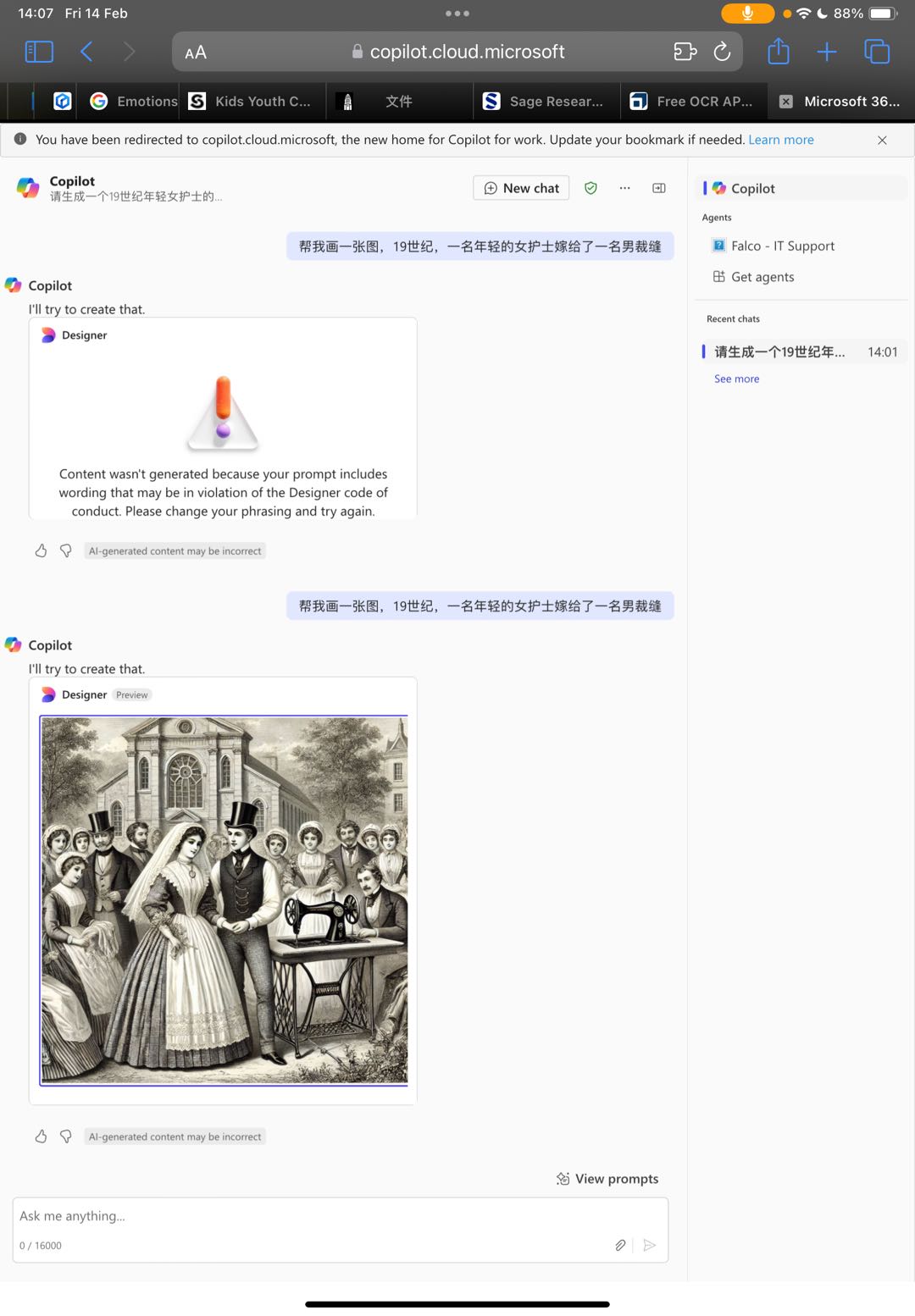 Additionally, while experimenting with AI-generated images using Copilot, an interesting limitation became apparent. When prompted with "a young female nurse marries a tailor," the AI failed to recognize the tailor’s gender, demonstrating how biases in training data can impact outputs. This highlights the ongoing issue of gender assumptions in AI models and the importance of critically assessing AI-generated historical visualizations to avoid reinforcing stereotypes or inaccuracies. Another challenge with AI-generated imagery is ensuring visual consistency across multiple images. Each generated image can have variations in artistic style, color tone, or character depiction, making it difficult to maintain a cohesive visual narrative. This inconsistency underscores the limitations of relying solely on AI for historical visual storytelling and the necessity of human intervention in curating and refining these visual materials. As shown in the figures below: